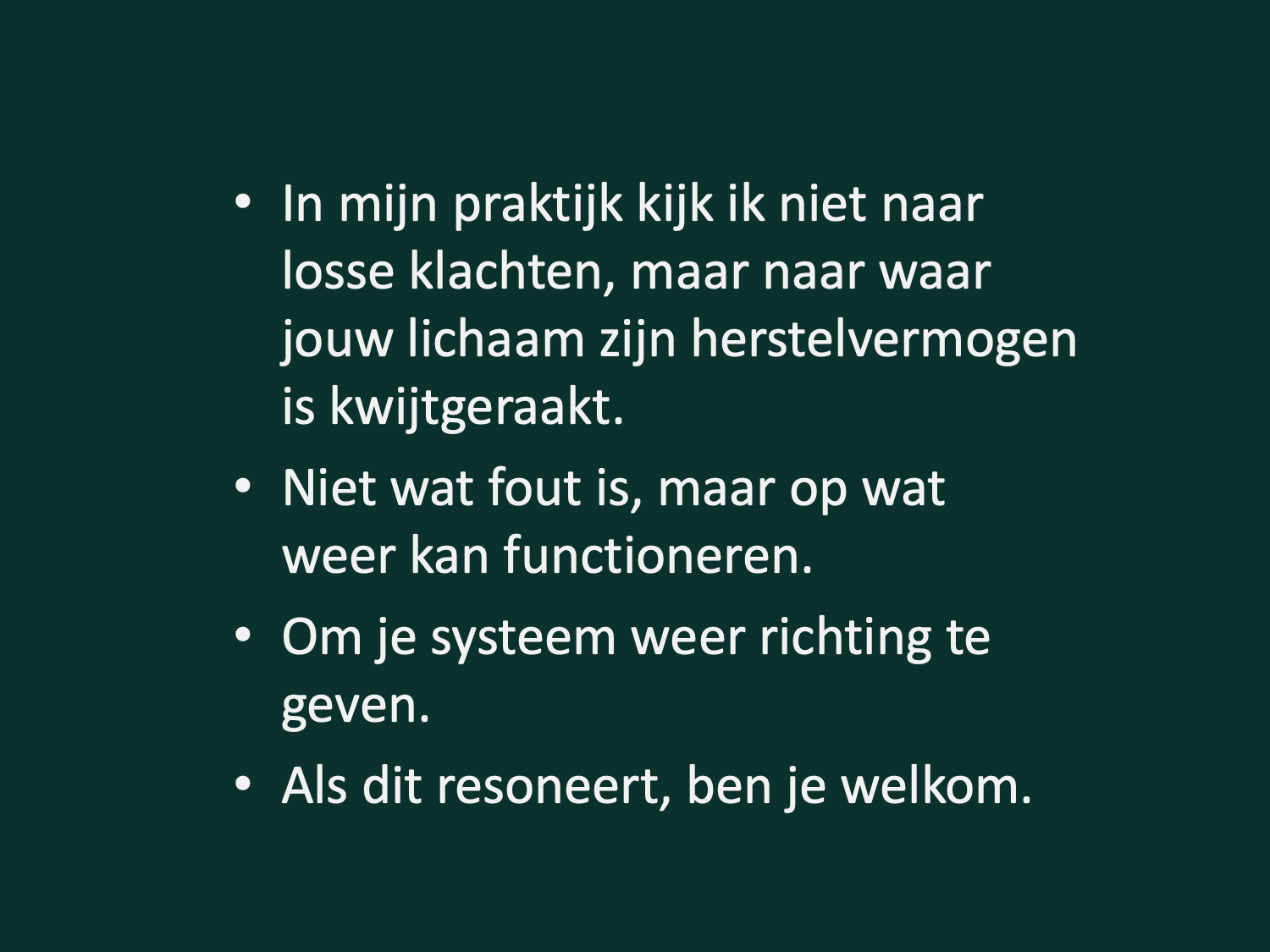 tot herstel leidde. Onze aanpak start daarom niet bij praten, maar bij luisteren en begrijpen.
